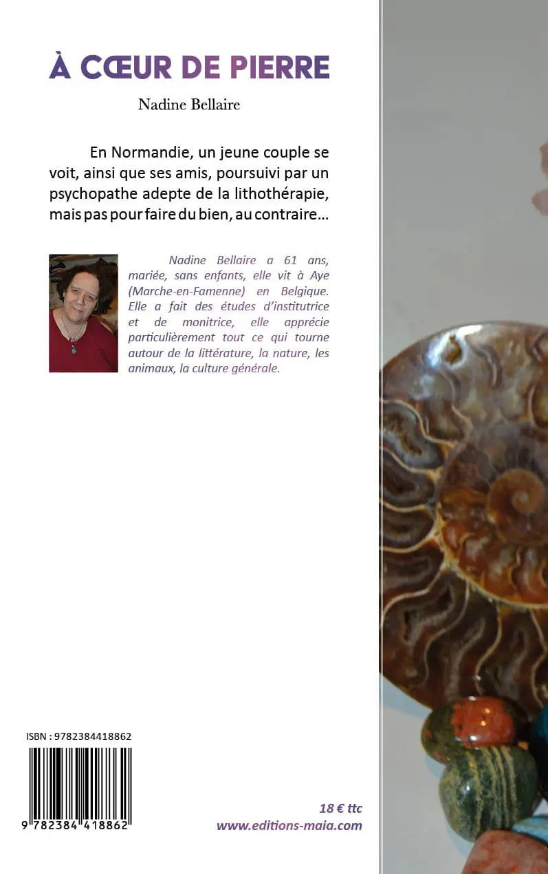 Nadine Bellaire a 61 ans, mariée, sans enfants, elle vit à Aye (Marche-en-Famenne) en Belgique. Elle a fait des études d’institutrice et de monitrice, elle apprécie particulièrement tout ce qui tourne autour de la littérature, la nature, les animaux, la culture générale.