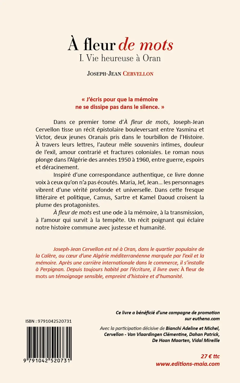 Dans ce premier tome d’À fleur de mots, Joseph-Jean Cervellon tisse un récit épistolaire bouleversant entre Yasmina et Victor, deux jeunes Oranais pris dans le tourbillon de l’Histoire. À travers leurs lettres, l’auteur mêle souvenirs intimes, douleur de l’exil, amour contrarié et fractures coloniales. Le roman nous plonge dans l’Algérie des années 1950 à 1960, entre guerre, espoirs et déracinement.