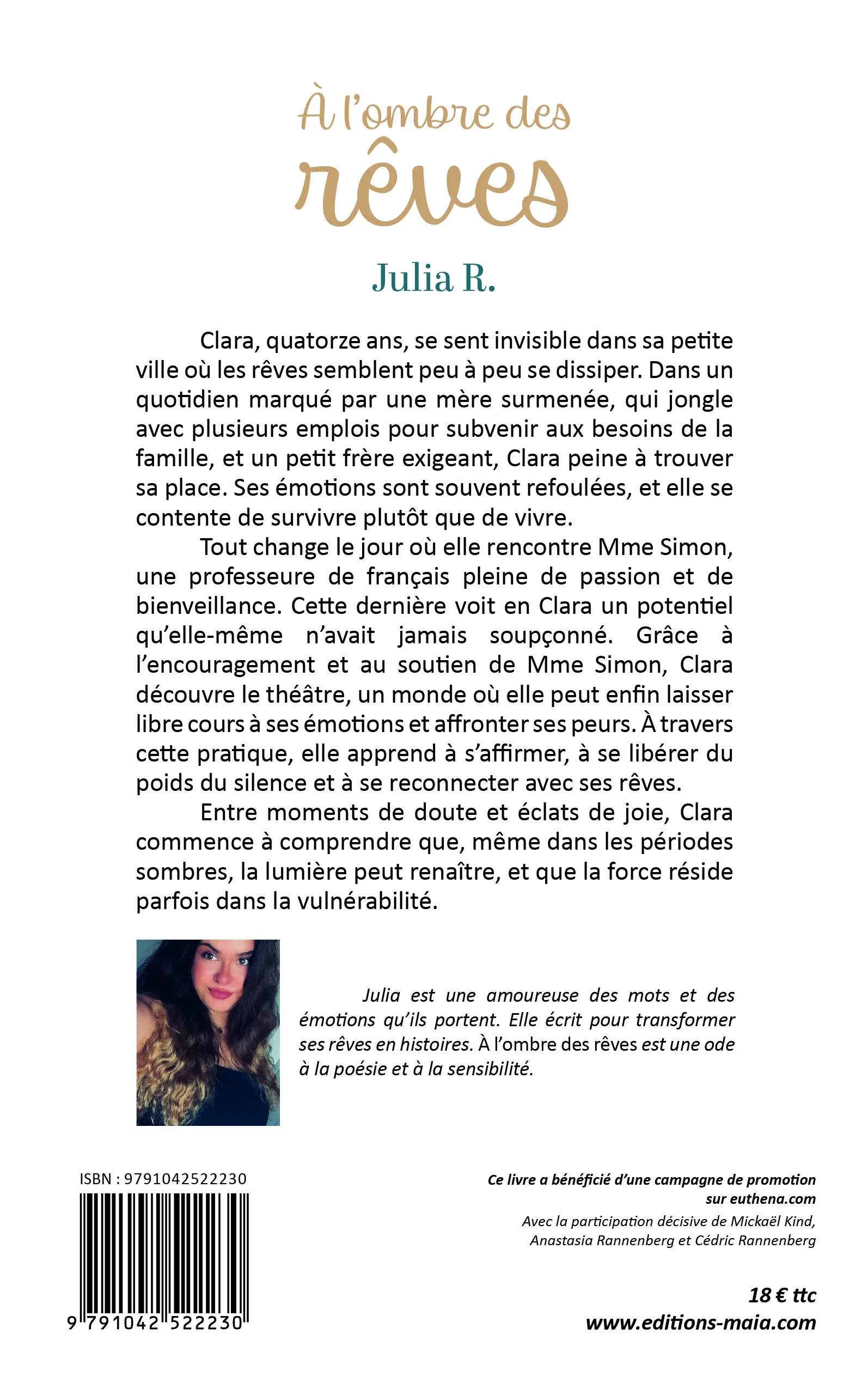 Julia est une amoureuse des mots et des émotions qu’ils portent. Elle écrit pour transformer ses rêves en histoires. À l’ombre des rêves est une ode à la poésie et à la sensibilité.