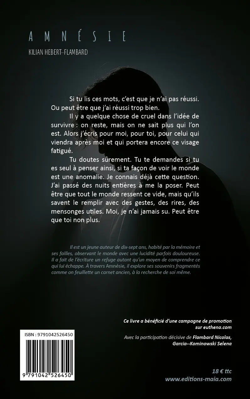 Il est un jeune auteur de dix-sept ans, habité par la mémoire et ses failles, observant le monde avec une lucidité parfois douloureuse. Il a fait de l’écriture un refuge autant qu’un moyen de comprendre ce qui lui échappe. À travers Amnésie, il explore ses souvenirs fragmentés comme on feuillette un carnet ancien, à la recherche de soi même.