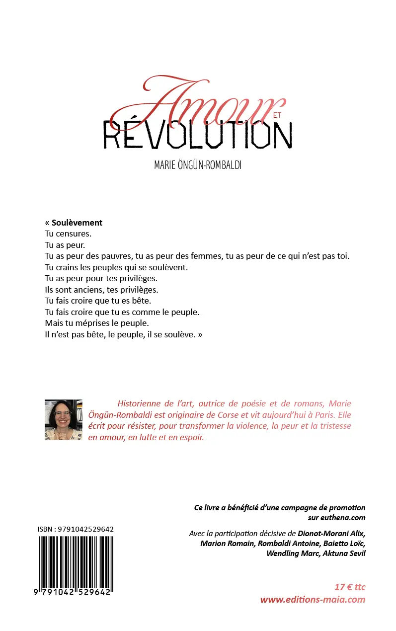 Historienne de l’art, autrice de poésie et de romans, Marie Öngün‑Rombaldi est originaire de Corse et vit aujourd’hui à Paris. Elle écrit pour résister, pour transformer la violence, la peur et la tristesse en amour, en lutte et en espoir.