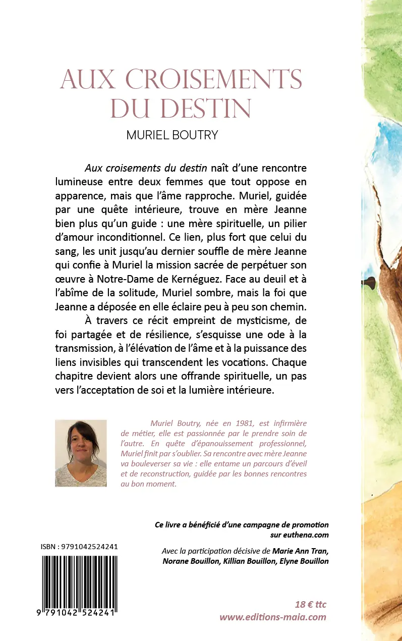 Aux croisements du destin naît d’une rencontre lumineuse entre deux femmes que tout oppose en apparence, mais que l’âme rapproche. Muriel, guidée par une quête intérieure, trouve en mère Jeanne bien plus qu’un guide : une mère spirituelle, un pilier d’amour inconditionnel. Ce lien, plus fort que celui du sang, les unit jusqu’au dernier souffle de mère Jeanne qui confie à Muriel la mission sacrée de perpétuer son œuvre à Notre-Dame de Kernéguez. Face au deuil et à l’abîme de la solitude, Muriel sombre, mais la foi que Jeanne a déposée en elle éclaire peu à peu son chemin.