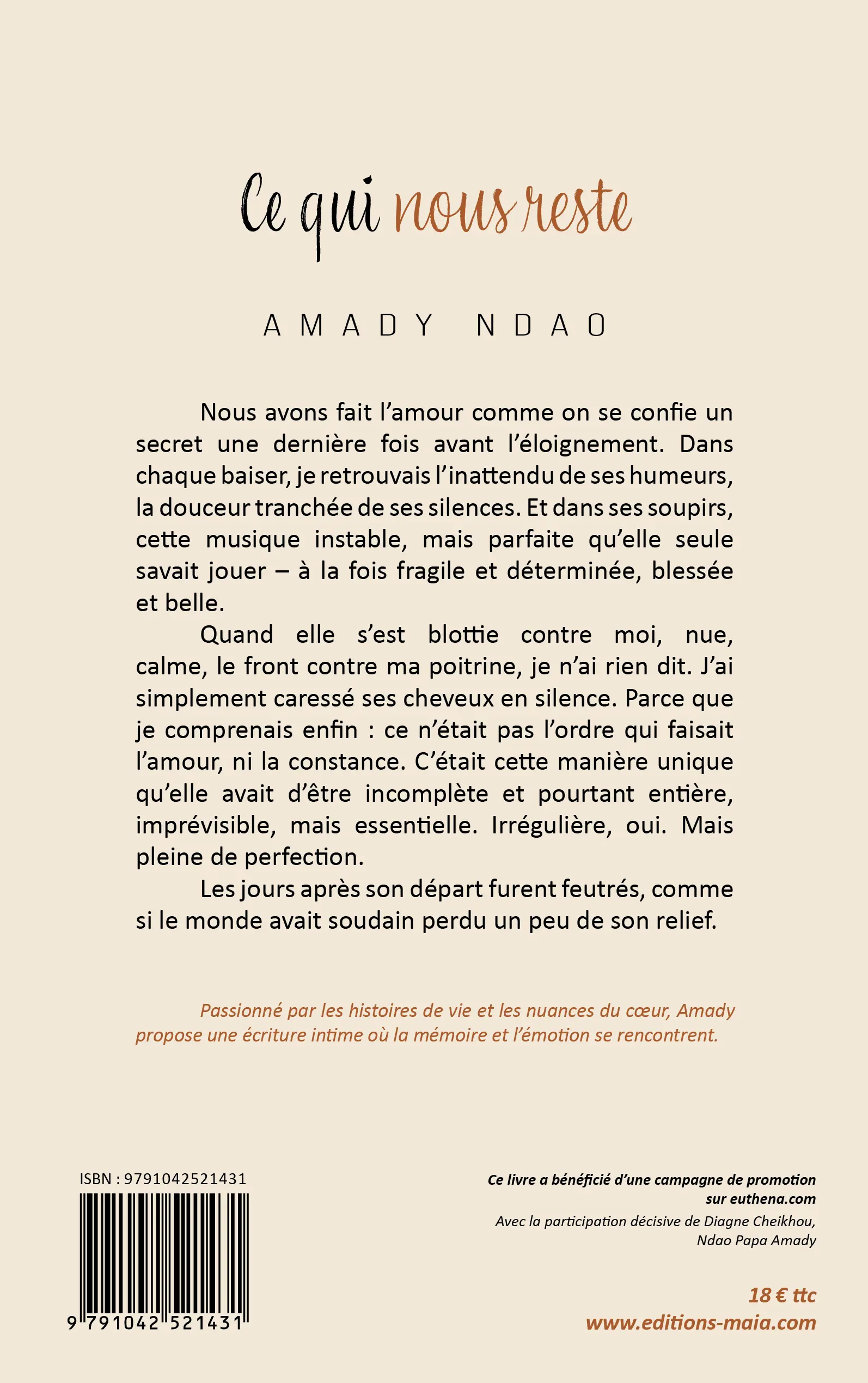 Passionné par les histoires de vie et les nuances du cœur, Amady propose une écriture intime où la mémoire et l’émotion se rencontrent.