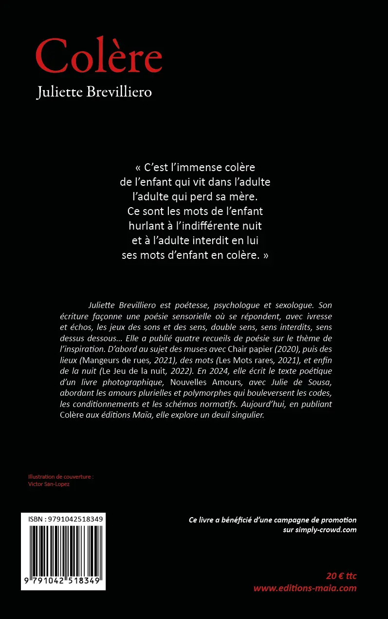 Juliette Brevilliero est poétesse, psychologue et sexologue. Son écriture façonne une poésie sensorielle où se répondent, avec ivresse et échos, les jeux des sons et des sens, double sens, sens interdits, sens dessus dessous… Elle a publié quatre recueils de poésie sur le thème de l’inspiration. D’abord au sujet des muses avec Chair papier (2020), puis des lieux (Mangeurs de rues, 2021), des mots (Les Mots rares, 2021), et enfin de la nuit (Le Jeu de la nuit, 2022). En 2024, elle écrit le texte poétique d’un livre photographique, Nouvelles Amours, avec Julie de Sousa, abordant les amours plurielles et polymorphes qui bouleversent les codes, les conditionnements et les schémas normatifs. Aujourd’hui, en publiant Colère aux éditions Maïa, elle explore un deuil singulier.