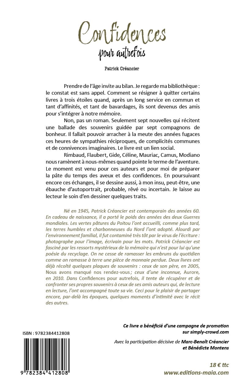 Né en 1945, Patrick Créancier est contemporain des années 60. En cadeau de naissance, il a porté le poids des années des deux Guerres mondiales. Les vertes pâtures du Poitou l’ont accueilli, comme plus tard, les terres humbles et charbonneuses du Nord l’ont adopté. Alourdi par l’environnement familial, il fut contaminé très tôt par le virus de l’écriture : photographe pour l’image, écrivain pour les mots. Patrick Créancier est fasciné par les ressorts mystérieux de la mémoire qui n’est pour lui qu’une poésie du recyclage. On ne cesse de ramasser les embruns du quotidien comme on ramasse à terre une pièce de monnaie perdue. Deux livres ont déjà récolté quelques plaques de souvenirs : ceux de son père, en 2005, Nous avons manqué nos rendez-vous ; ceux d’une inconnue, Aurore, en 2010. Dans Confidences pour autrefois, il tente de récupérer et de confronter ses propres souvenirs à ceux de ses amis auteurs qui, de lecture en lecture, l’ont accompagné toute sa vie. Ceci pour le plaisir de partager encore, par-delà les époques, quelques moments d’intimité avec le récit des autres.