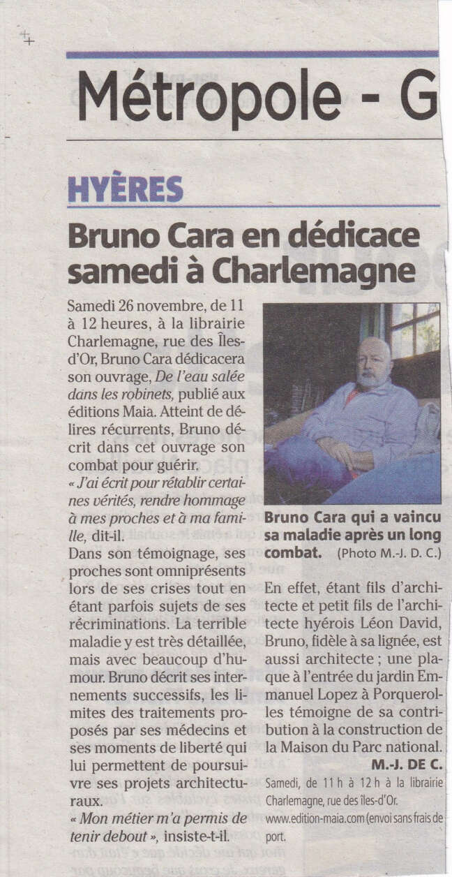 Atteint de délires récurrents, un architecte décrit ses crises qui font maintenant partie de son passé : comment elles sont arrivées et se sont dissipées, la vie reprenant dans les intervalles. Ayant connu, à plusieurs reprises, des internements en établissements spécialisés, il décrit les rapports de la médecine psychiatrique et du patient au long cours qu’il est devenu au fil des années. Cette chronique à travers ses épisodes les plus marquants déborde largement sur d’autres domaines, en évoquant en particulier les cabanons de bord de mer qui sont à l’origine du métier du narrateur. Au-delà d’un récit sur une affection mentale, ce témoignage dresse le portrait d’une région privilégiée dans laquelle Bruno Cara s’épanouit depuis sa jeunesse : Hyères, ses îles, ses environs et quelques voyages lointains en contrepoint.