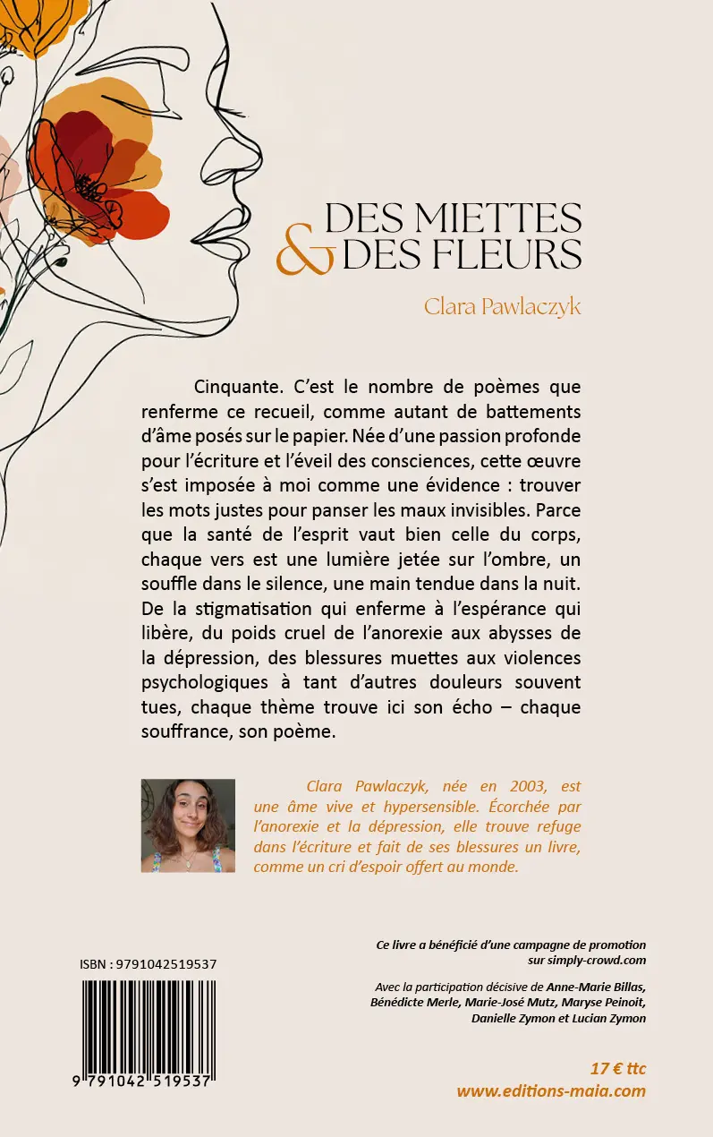 Clara Pawlaczyk, née en 2003, est une âme vive et hypersensible. Écorchée par l’anorexie et la dépression, elle trouve refuge dans l’écriture et fait de ses blessures un livre, comme un cri d’espoir offert au monde.