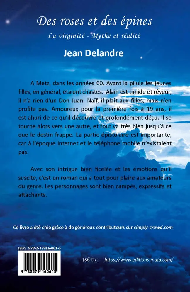 A Metz, dans les années 60. Avant la pilule les jeunes filles, en général, étaient chastes. Alain est timide et rêveur, il n’a rien d’un Don Juan. Naïf, il plaît aux filles, mais n’en profite pas. Amoureux pour la première fois à 19 ans, il est ahuri de ce qu’il découvre et profondément déçu. Il se tourne alors vers une autre, et tout va très bien jusqu’à ce que le destin frappe. La partie épistolaire est importante, car à l’époque internet et le téléphone mobile n’existaient pas. Avec son intrigue bien ficelée et les émotions qu’il suscite, c’est un roman qui a tout pour plaire aux amateurs du genre. Les personnages sont bien campés, expressifs et attachants.