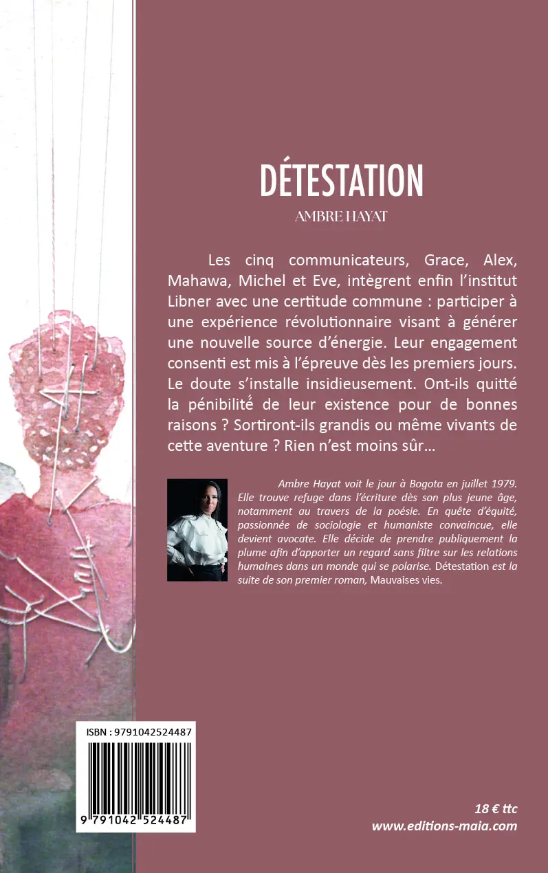 Ambre Hayat voit le jour à Bogota en juillet 1979. Elle trouve refuge dans l’écriture dès son plus jeune âge, notamment au travers de la poésie. En quête d’équité, passionnée de sociologie et humaniste convaincue, elle devient avocate. Elle décide de prendre publiquement la plume afin d’apporter un regard sans filtre sur les relations humaines dans un monde qui se polarise. Détestation est la suite de son premier roman, Mauvaises vies.