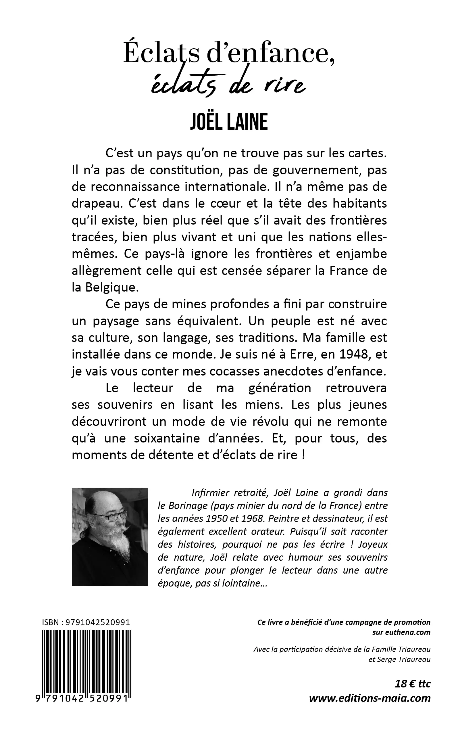 Infirmier retraité, Joël Laine a grandi dans le Borinage (pays minier du nord de la France) entre les années 1950 et 1968. Peintre et dessinateur, il est également excellent orateur. Puisqu’il sait raconter des histoires, pourquoi ne pas les écrire ! Joyeux de nature, Joël relate avec humour ses souvenirs d’enfance pour plonger le lecteur dans une autre époque, pas si lointaine…