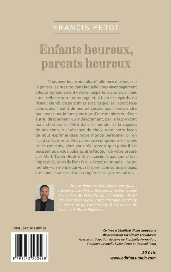 Francis Petot est praticien et enseignant international en PNL, en hypnose, en neurothérapie (envolution de l’EMDR), en mBraining… Il est président de l’école de psychothérapie Psynfinity en France et au Luxembourg. Il est auteur de livres sur la PNL et l’hypnose.