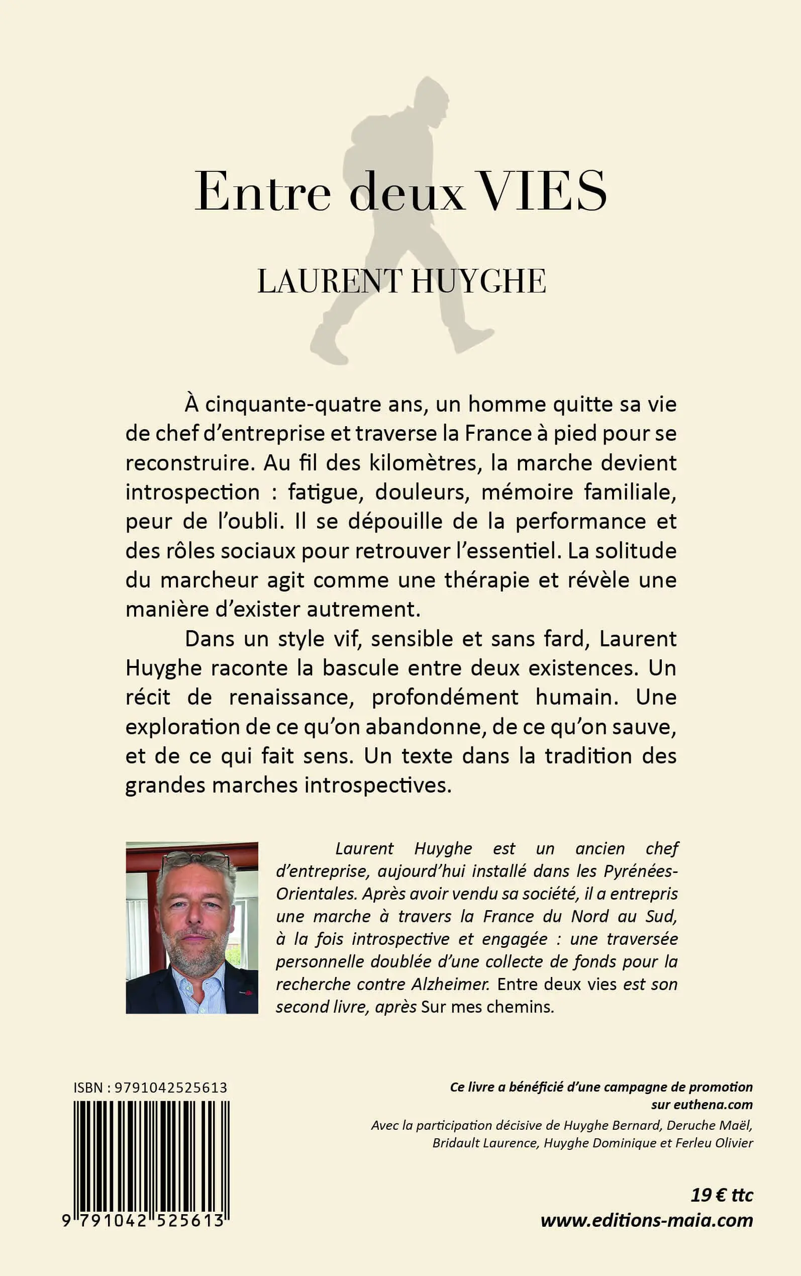Laurent Huyghe est un ancien chef d’entreprise, aujourd’hui installé dans les Pyrénées-Orientales. Après avoir vendu sa société, il a entrepris une marche à travers la France du Nord au Sud, à la fois introspective et engagée : une traversée personnelle doublée d’une collecte de fonds pour la recherche contre Alzheimer. Entre deux vies est son second livre, après Sur mes chemins.