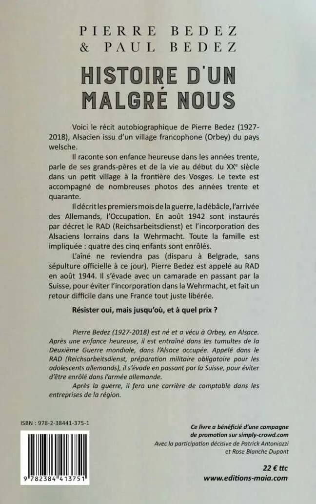 Pierre Bedez (1927-2018) est né et a vécu à Orbey, en Alsace. Après une enfance heureuse, il est entraîné dans les tumultes de la Deuxième Guerre mondiale, dans l’Alsace occupée. Appelé dans le RAD (Reichsarbeitsdienst, préparation militaire obligatoire pour les adolescents allemands), il s’évade en passant par la Suisse, pour éviter d’être enrôlé dans l’armée allemande.