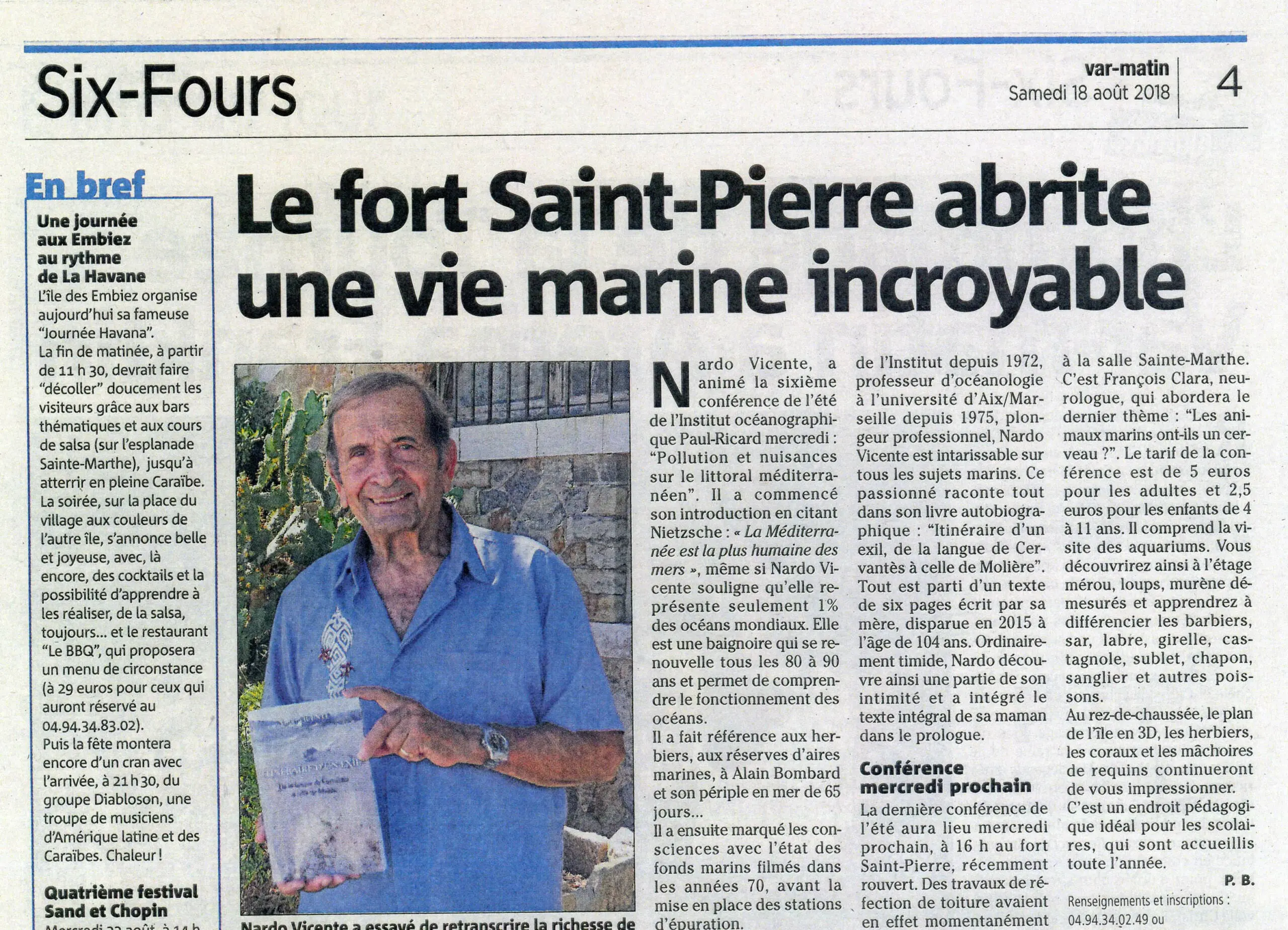 La guerre civile éclate en Espagne en Juillet 1936, et Nardo Vicente naît le 14 Août. Les franquistes prennent le pouvoir, et deux ans et demi plus tard la famille Vicente fuit vers la France. C’est l’exil et le camp de concentration d’Argelès et puis une vie nouvelle en Provence sous l’occupation allemande. Nardo est scolarisé au Luc en Provence et découvre la langue de Molière. La libération conduit la famille Vicente à Marseille, et c’est la découverte de la Méditerranée et l’immersion totale de l’auteur dans cette mer si bleue à l’origine de sa vocation de Biologiste marin. La vie familiale se déroule sans nuage avec une mère courageuse qui subvient aux besoins du ménage. Le jeune Nardo effectue des études secondaires puis supérieures à la faculté des Sciences de Marseille où il deviendra lui-même enseignant-chercheur en biologie, conduisant sa recherche scientifique à la Station marine d’Endoume à Marseille. Une recherche consacrée à la défense de la Mare nostrum. La plongée sous-marine permet à l’auteur de découvrir d’autres horizons, de parcourir l’Océan mondial, et de nouer de belles collaborations à Madagascar, en Australie, au Mexique, et bien sûr avec son pays d’origine l’Espagne, et ceux du pourtour méditerranéen.