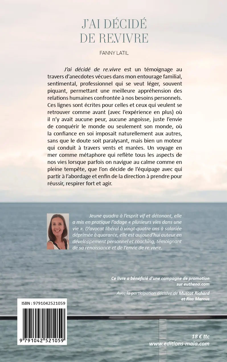 J’ai décidé de re.vivre est un témoignage au travers d’anecdotes vécues dans mon entourage familial, sentimental, professionnel qui se veut léger, souvent piquant, permettant une meilleure appréhension des relations humaines confrontée à nos besoins personnels. Ces lignes sont écrites pour celles et ceux qui veulent se retrouver comme avant (avec l’expérience en plus) où il n’y avait aucune peur, aucune angoisse, juste l’envie de conquérir le monde ou seulement son monde, où la confiance en soi imposait naturellement aux autres, sans que le doute soit paralysant, mais bien un moteur qui conduit à travers vents et marées. Un voyage en mer comme métaphore qui reflète tous les aspects de nos vies lorsque parfois on navigue au calme comme en pleine tempête, que l’on décide de l’équipage avec qui partir à l’abordage et enfin de la direction à prendre pour réussir, respirer fort et agir.