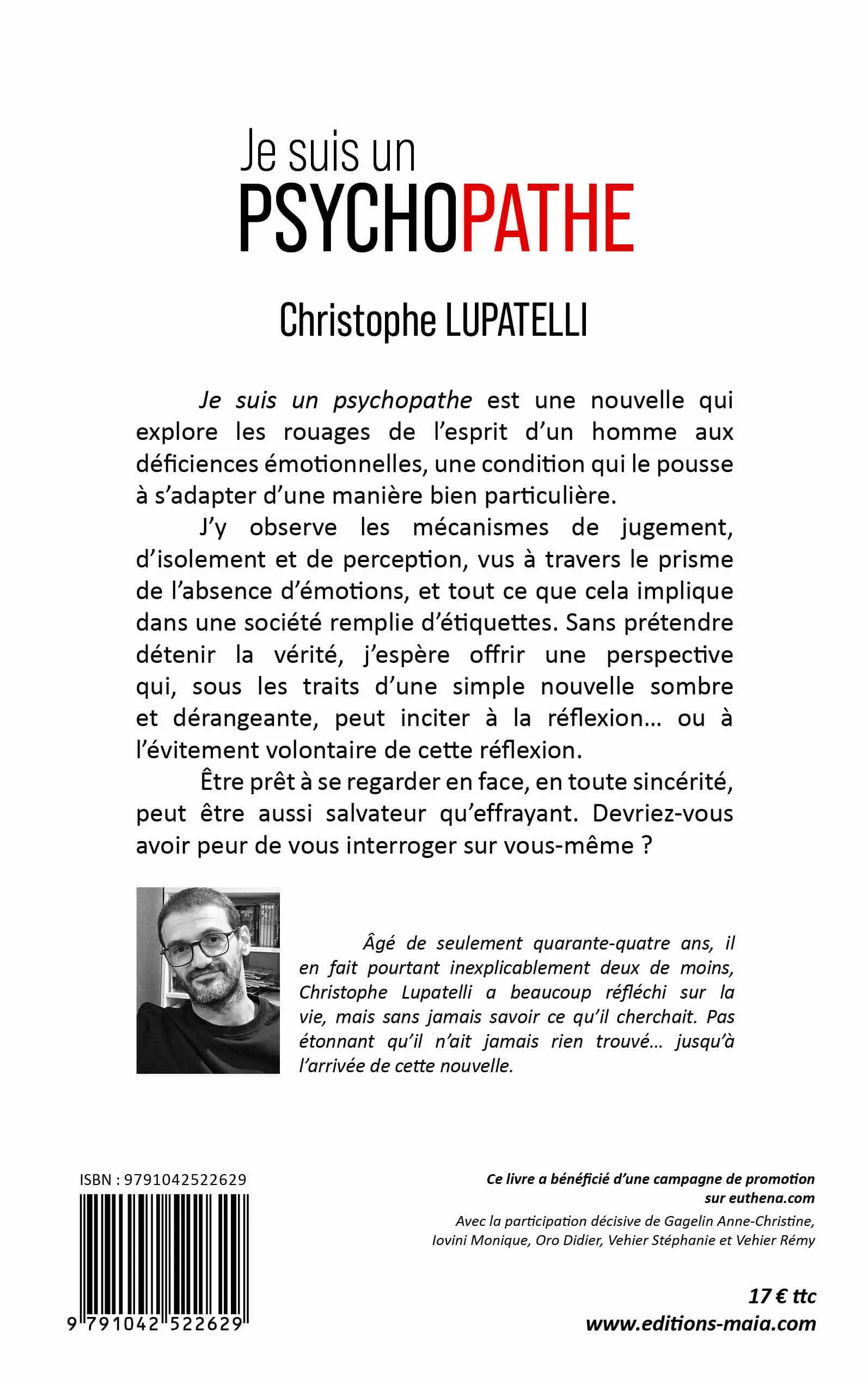 Je suis un psychopathe est une nouvelle qui explore les rouages de l’esprit d’un homme aux déficiences émotionnelles, une condition qui le pousse à s’adapter d’une manière bien particulière. J’y observe les mécanismes de jugement, d’isolement et de perception, vus à travers le prisme de l’absence d’émotions, et tout ce que cela implique dans une société remplie d’étiquettes. Sans prétendre détenir la vérité, j’espère offrir une perspective qui, sous les traits d’une simple nouvelle sombre et dérangeante, peut inciter à la réflexion… ou à l’évitement volontaire de cette réflexion. Être prêt à se regarder en face, en toute sincérité, peut être aussi salvateur qu’effrayant. Devriez-vous avoir peur de vous interroger sur vous-même ?