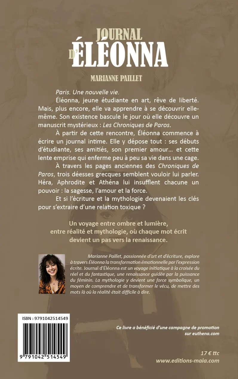 Marianne Paillet, passionnée d’art et d’écriture, explore à travers Éléonna la transformation émotionnelle par l’expression écrite. Journal d’Éléonna est un voyage initiatique à la croisée du réel et du fantastique, une renaissance guidée par la puissance du féminin. La mythologie y devient une force symbolique, un moyen de comprendre et de transformer le vécu, de mettre des mots là où la réalité était difficile à dire.
