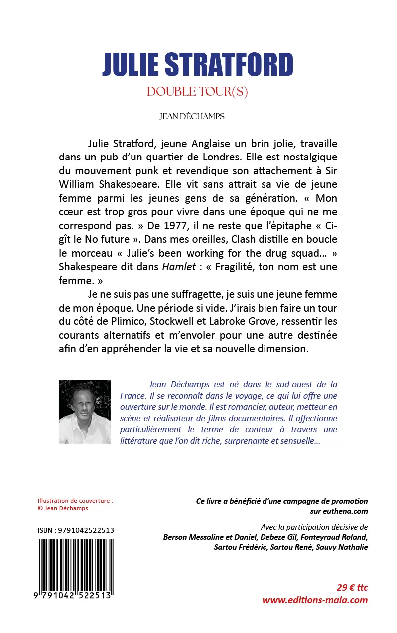 Julie Stratford, jeune Anglaise un brin jolie, travaille dans un pub d’un quartier de Londres. Elle est nostalgique du mouvement punk et revendique son attachement à Sir William Shakespeare. Elle vit sans attrait sa vie de jeune femme parmi les jeunes gens de sa génération. « Mon cœur est trop gros pour vivre dans une époque qui ne me correspond pas. » De 1977, il ne reste que l’épitaphe « Ci-gît le No future ». Dans mes oreilles, Clash distille en boucle le morceau « Julie’s been working for the drug squad… » Shakespeare dit dans Hamlet : « Fragilité, ton nom est une femme. »