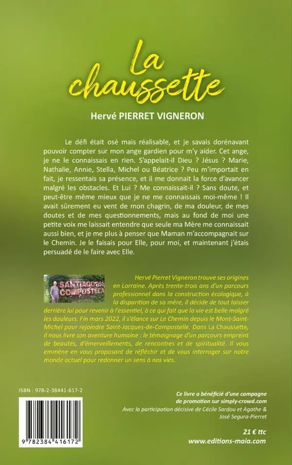 Hervé Pierret Vigneron trouve ses origines en Lorraine. Après trente-trois ans d’un parcours professionnel dans la construction écologique, à la disparition de sa mère, il décide de tout laisser derrière lui pour revenir à l’essentiel, à ce qui fait que la vie est belle malgré les douleurs. Fin mars 2022, il s’élance sur Le Chemin depuis le Mont-Saint-Michel pour rejoindre Saint-Jacques-de-Compostelle. Dans La Chaussette, il nous livre son aventure humaine : le témoignage d’un parcours empreint de beautés, d’émerveillements, de rencontres et de spiritualité. Il vous emmène en vous proposant de réfléchir et de vous interroger sur notre monde actuel pour redonner un sens à nos vies.