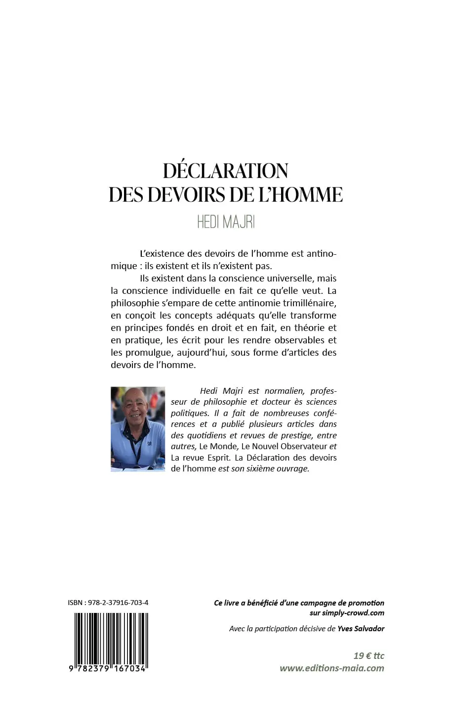 Hedi Majri est normalien, professeur de philosophie et docteur ès sciences politiques. Il a fait de nombreuses conférences et a publié plusieurs articles dans des quotidiens et revues de prestige, entre autres, Le Monde, Le Nouvel Observateur et La revue Esprit. La Déclaration des devoirs de l’homme est son sixième ouvrage.