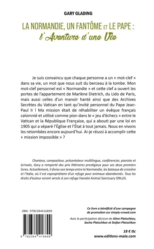 Je suis convaincu que chaque personne a un « mot-clef » dans sa vie, un mot que nous suit du berceau à la tombe. Mon mot-clef personnel est « Normandie » et cette clef a ouvert les portes de l’appartement de Marlène Dietrich, du Lido de Paris, mais aussi celles d’un manoir hanté ainsi que des Archives Secrètes du Vatican en tant qu’invité personnel du Pape Jean-Paul II ! Ma mission était de réhabiliter un évêque français calomnié et utilisé comme pion dans le « jeu d’échecs » entre le Vatican et la République Française, qui a abouti par une loi en 1905 qui a séparé l’Église et l’État à tout jamais. Nous en vivons les retombées encore aujourd’hui. Ai-je réussi à accomplir cette « mission impossible » ?