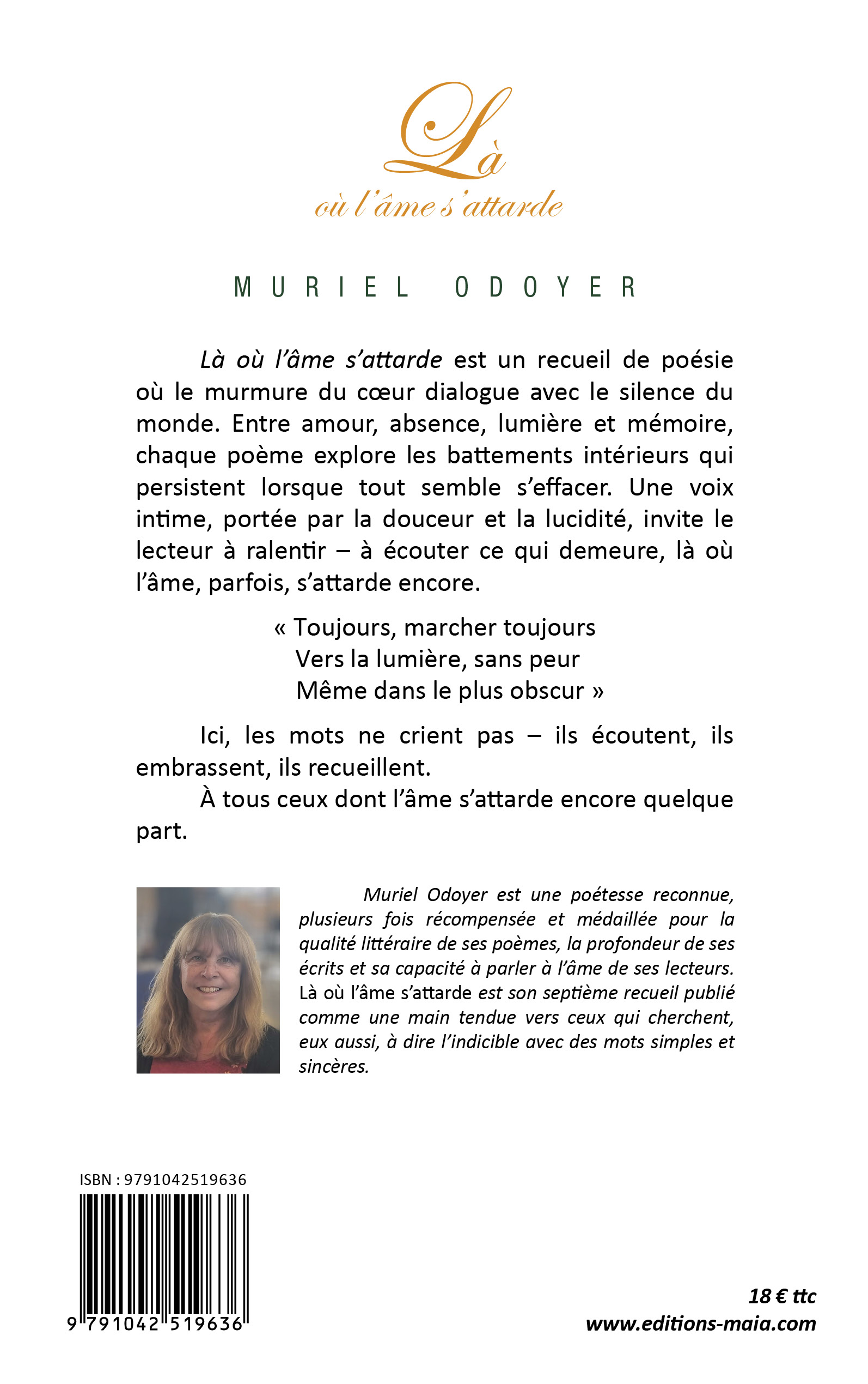 Muriel Odoyer est une poétesse reconnue, plusieurs fois récompensée et médaillée pour la qualité littéraire de ses poèmes, la profondeur de ses écrits et sa capacité à parler à l’âme de ses lecteurs. Là où l’âme s’attarde est son septième recueil publié comme une main tendue vers ceux qui cherchent, eux aussi, à dire l’indicible avec des mots simples et sincères.