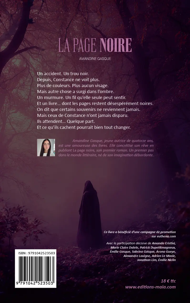 Amandine Gasque, jeune autrice de quatorze ans, est une amoureuse des livres. Elle concrétise son rêve en publiant La page noire, son premier roman. Un premier pas dans le monde littéraire, né de son imagination débordante.