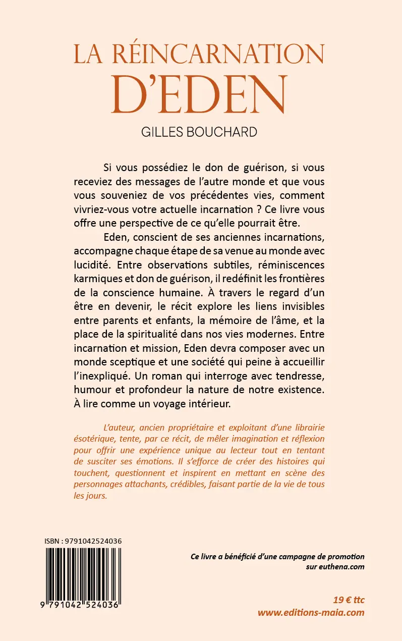 Eden, conscient de ses anciennes incarnations, accompagne chaque étape de sa venue au monde avec lucidité. Entre observations subtiles, réminiscences karmiques et don de guérison, il redéfinit les frontières de la conscience humaine. À travers le regard d’un être en devenir, le récit explore les liens invisibles entre parents et enfants, la mémoire de l’âme, et la place de la spiritualité dans nos vies modernes. Entre incarnation et mission, Eden devra composer avec un monde sceptique et une société qui peine à accueillir l’inexpliqué. Un roman qui interroge avec tendresse, humour et profondeur la nature de notre existence. À lire comme un voyage intérieur.
