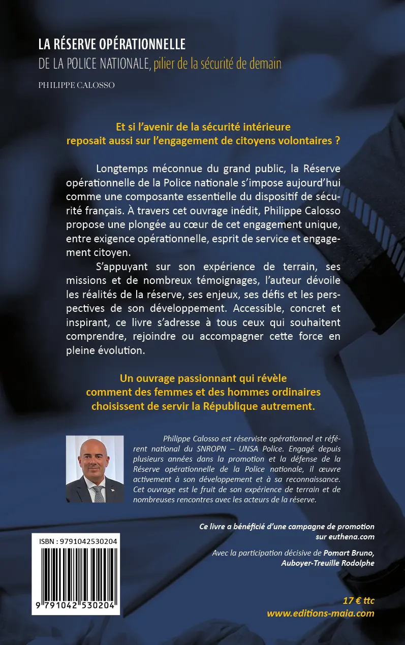 Philippe Calosso est réserviste opérationnel et référent national du SNROPN – UNSA Police. Engagé depuis plusieurs années dans la promotion et la défense de la Réserve opérationnelle de la Police nationale, il œuvre activement à son développement et à sa reconnaissance. Cet ouvrage est le fruit de son expérience de terrain et de nombreuses rencontres avec les acteurs de la réserve.
