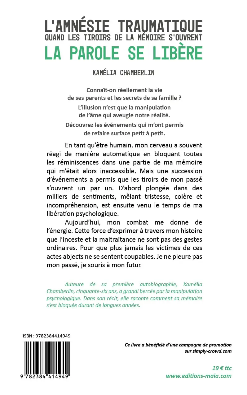 Auteure de sa première autobiographie, Kamélia Chamberlin, cinquante-six ans, a grandi bercée par la manipulation psychologique. Dans son récit, elle raconte comment sa mémoire s’est bloquée durant de longues années.