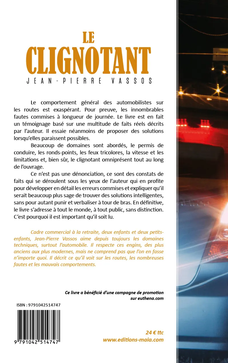 Cadre commercial à la retraite, deux enfants et deux petits-enfants, Jean-Pierre Vassos aime depuis toujours les domaines techniques, surtout l’automobile. Il respecte ces engins, des plus anciens aux plus modernes, mais ne comprend pas que l’on en fasse n’importe quoi. Il décrit ce qu’il voit sur les routes, les nombreuses fautes et les mauvais comportements.