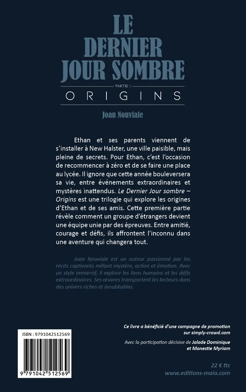 Ethan et ses parents viennent de s’installer à New Halster, une ville paisible, mais pleine de secrets. Pour Ethan, c’est l’occasion de recommencer à zéro et de se faire une place au lycée. Il ignore que cette année bouleversera sa vie, entre événements extraordinaires et mystères inattendus. Le Dernier Jour sombre – Origins est une trilogie qui explore les origines d’Ethan et de ses amis. Cette première partie révèle comment un groupe d’étrangers devient une équipe unie par des épreuves. Entre amitié, courage et défis, ils affrontent l’inconnu dans une aventure qui changera tout.