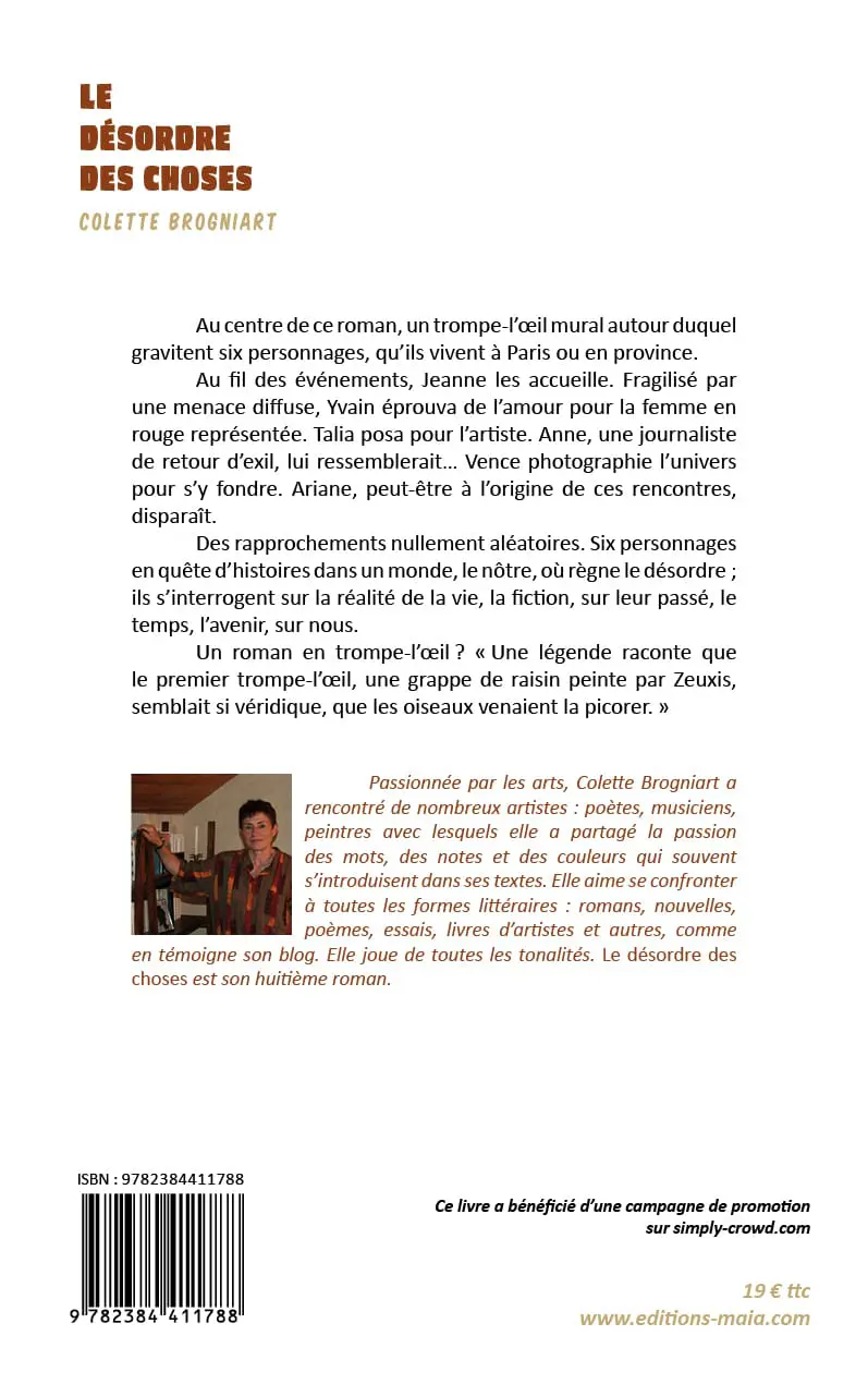 Passionnée par les arts, Colette Brogniart a rencontré de nombreux artistes : poètes, musiciens, peintres avec lesquels elle a partagé la passion des mots, des notes et des couleurs qui souvent s’introduisent dans ses textes. Elle aime se confronter à toutes les formes littéraires : romans, nouvelles, poèmes, essais, livres d’artistes et autres, comme en témoigne son blog. Elle joue de toutes les tonalités. Le désordre des choses est son huitième roman.