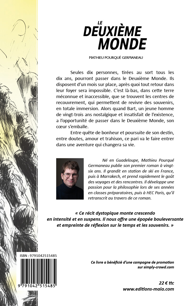 Seules dix personnes, tirées au sort tous les dix ans, pourront passer dans le Deuxième Monde. Ils disposent d’un mois sur place, après quoi tout retour dans leur foyer sera impossible. C’est là-bas, dans cette terre méconnue et inaccessible, que se trouvent les centres de recouvrement, qui permettent de revivre des souvenirs, en totale immersion. Alors quand Bart, un jeune homme de vingt-trois ans nostalgique et insatisfait de l’existence, a l’opportunité de passer dans le Deuxième Monde, son cœur s’emballe.