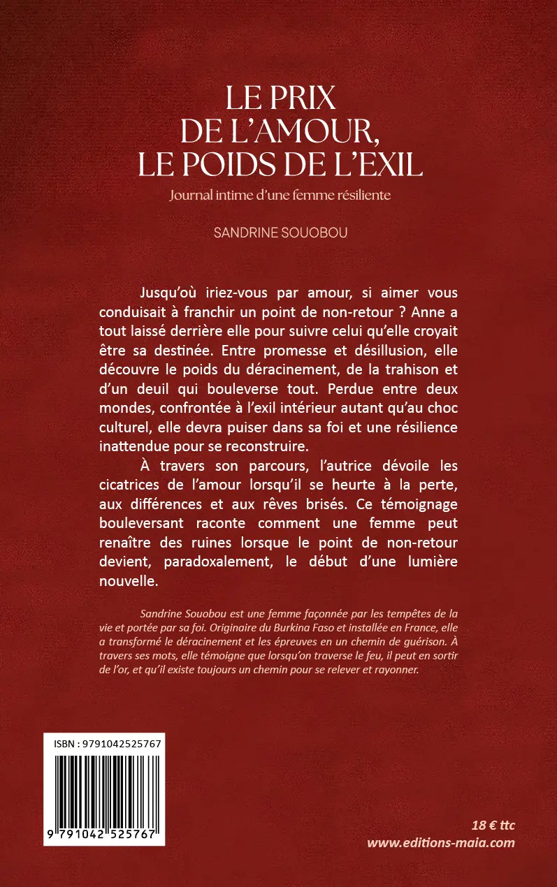 Jusqu’où iriez-vous par amour, si aimer vous conduisait à franchir un point de non-retour ? Anne a tout laissé derrière elle pour suivre celui qu’elle croyait être sa destinée. Entre promesse et désillusion, elle découvre le poids du déracinement, de la trahison et d’un deuil qui bouleverse tout. Perdue entre deux mondes, confrontée à l’exil intérieur autant qu’au choc culturel, elle devra puiser dans sa foi et une résilience inattendue pour se reconstruire.