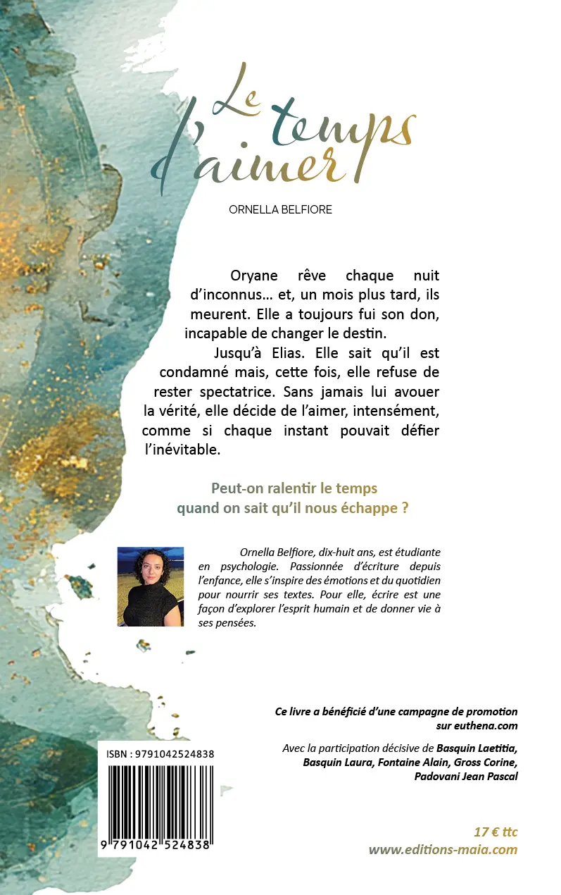 Ornella Belfiore, dix-huit ans, est étudiante en psychologie. Passionnée d’écriture depuis l’enfance, elle s’inspire des émotions et du quotidien pour nourrir ses textes. Pour elle, écrire est une façon d’explorer l’esprit humain et de donner vie à ses pensées.