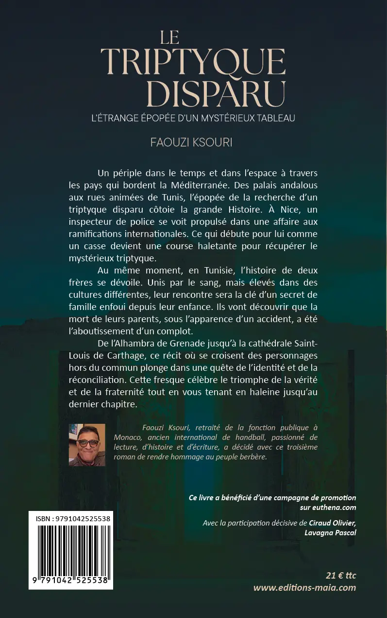 Un périple dans le temps et dans l’espace à travers les pays qui bordent la Méditerranée. Des palais andalous aux rues animées de Tunis, l’épopée de la recherche d’un triptyque disparu côtoie la grande Histoire. À Nice, un inspecteur de police se voit propulsé dans une affaire aux ramifications internationales. Ce qui débute pour lui comme un casse devient une course haletante pour récupérer le mystérieux triptyque.