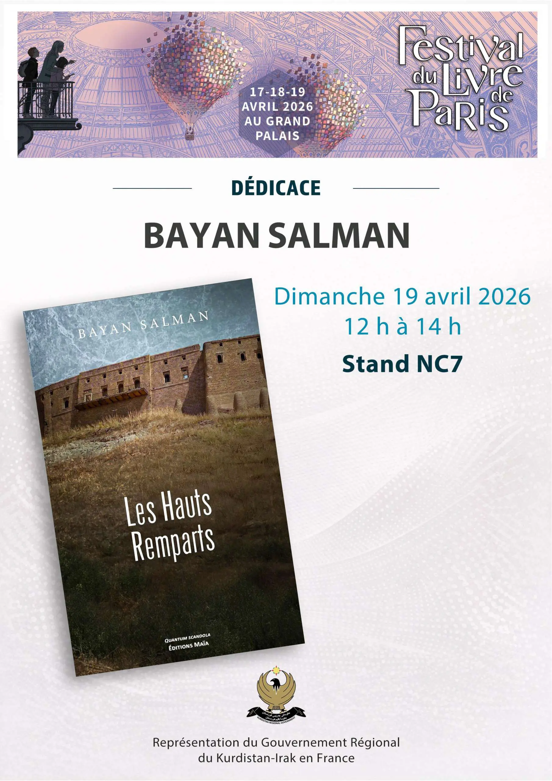 Romancière d’origine kurde, vivant à Paris, Bayan Salman est née à Kirkuk en Irak. Elle est l’auteur, en langue kurde, de nombreux romans, recueils de poèmes et essais. Elle a traduit, du français en kurde, Les Métamorphoses d’Ovide, des œuvres de Voltaire, Rimbaud, Mallarmé, Ionesco,