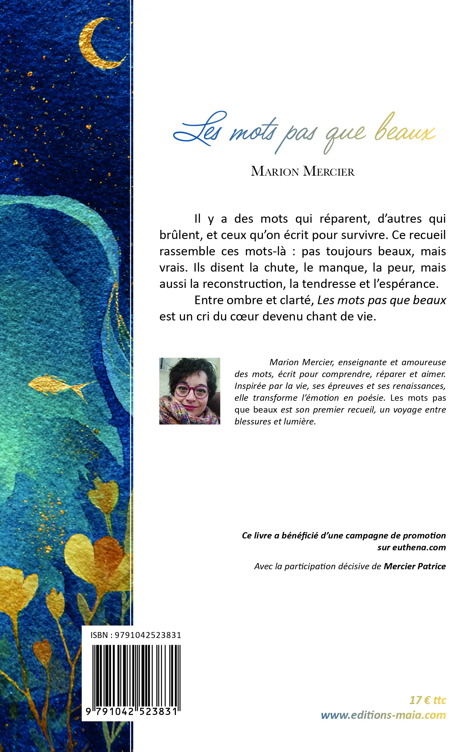 Marion Mercier, enseignante et amoureuse des mots, écrit pour comprendre, réparer et aimer. Inspirée par la vie, ses épreuves et ses renaissances, elle transforme l’émotion en poésie. Les mots pas que beaux est son premier recueil, un voyage entre blessures et lumière.