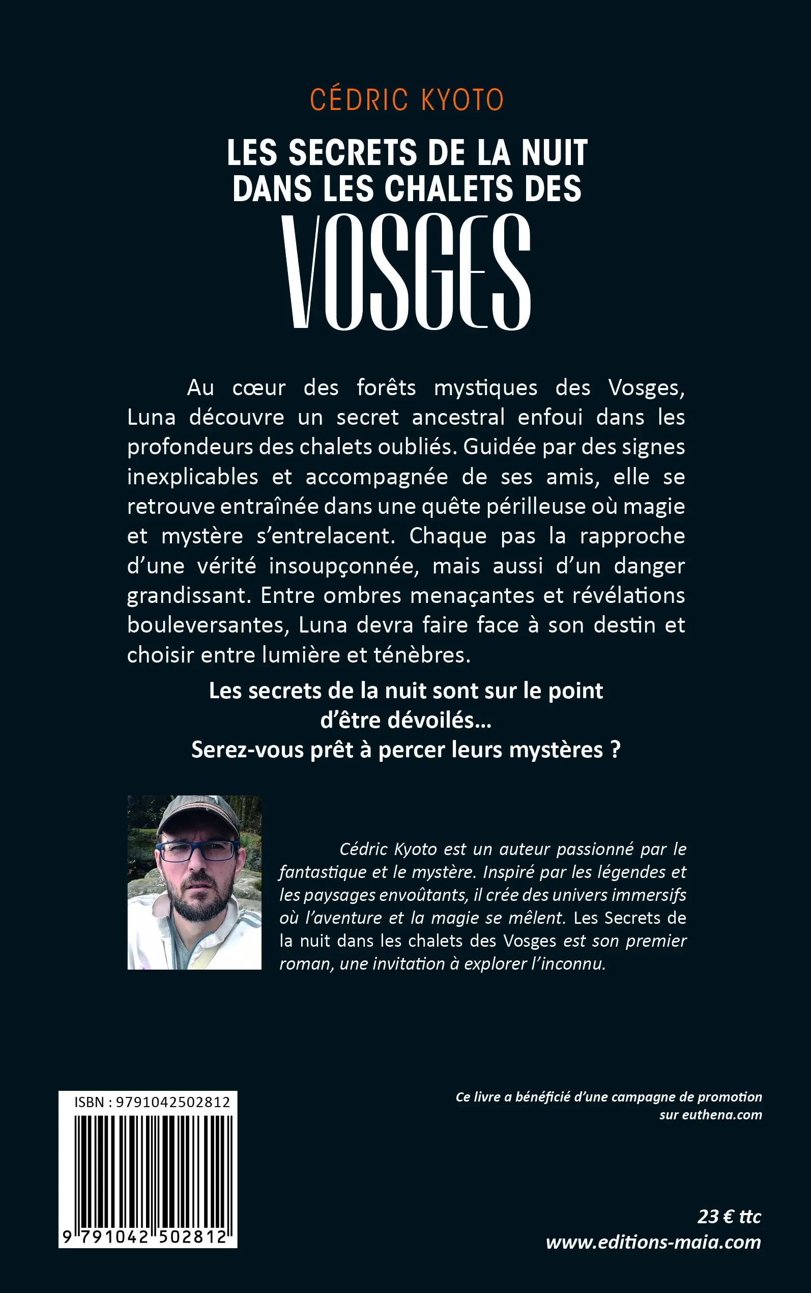 Cédric Kyoto est un auteur passionné par le fantastique et le mystère. Inspiré par les légendes et les paysages envoûtants, il crée des univers immersifs où l’aventure et la magie se mêlent. Les Secrets de la nuit dans les chalets des Vosges est son premier roman, une invitation à explorer l’inconnu.