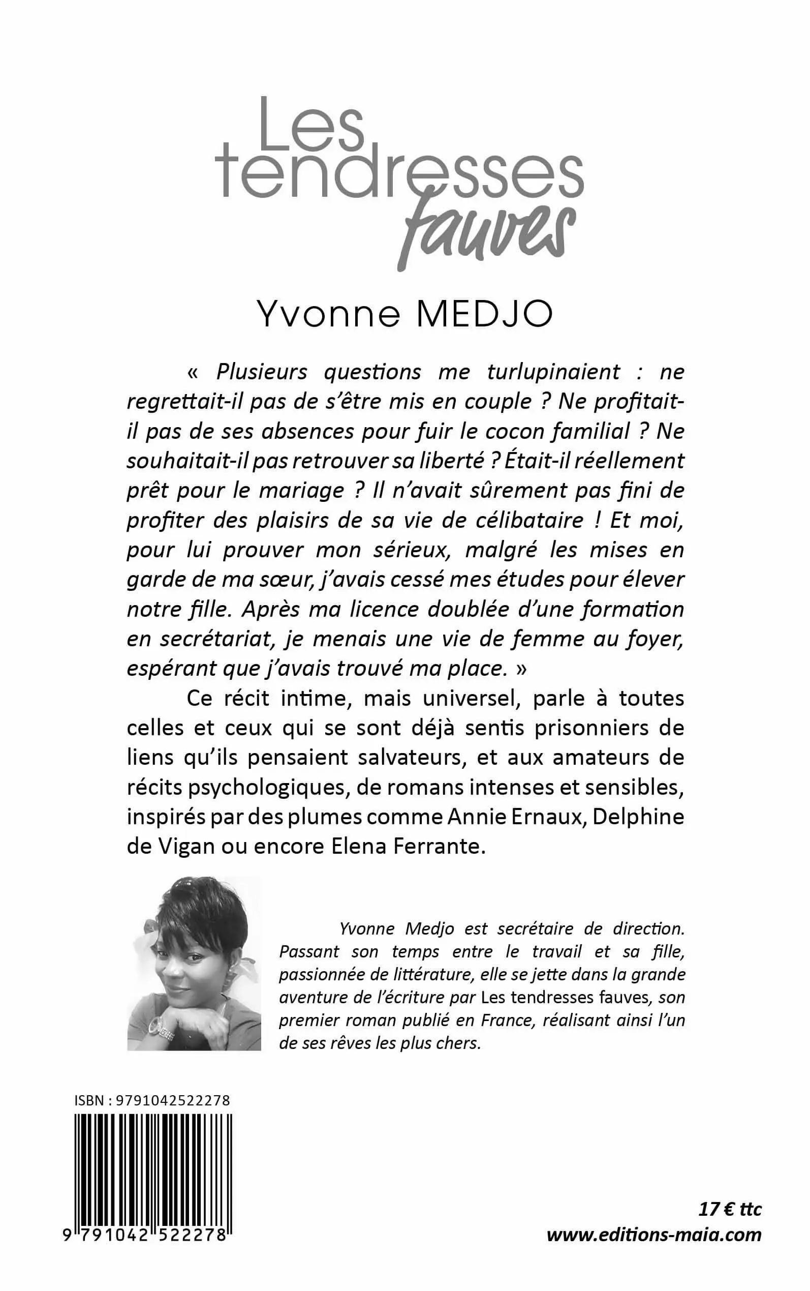 Yvonne Medjo est secrétaire de direction. Passant son temps entre le travail et sa fille, passionnée de littérature, elle se jette dans la grande aventure de l’écriture par Les tendresses fauves, son premier roman publié en France, réalisant ainsi l’un de ses rêves les plus chers.