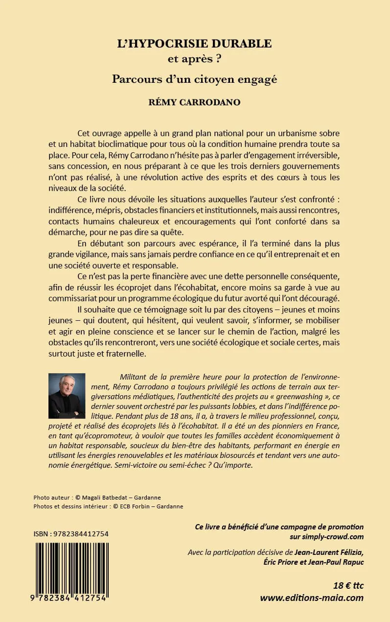 Militant de la première heure pour la protection de l’environnement, Rémy Carrodano a toujours privilégié les actions de terrain aux tergiversations médiatiques, l’authenticité des projets au « greenwashing », ce dernier souvent orchestré par les puissants lobbies, et dans l’indifférence politique. Pendant plus de 18 ans, il a, à travers le milieu professionnel, conçu, projeté et réalisé des écoprojets liés à l’écohabitat. Il a été un des pionniers en France, en tant qu’écopromoteur, à vouloir que toutes les familles accèdent économiquement à un habitat responsable, soucieux du bien-être des habitants, performant en énergie en utilisant les énergies renouvelables et les matériaux biosourcés et tendant vers une autonomie énergétique. Semi-victoire ou semi-échec ? Qu’importe.