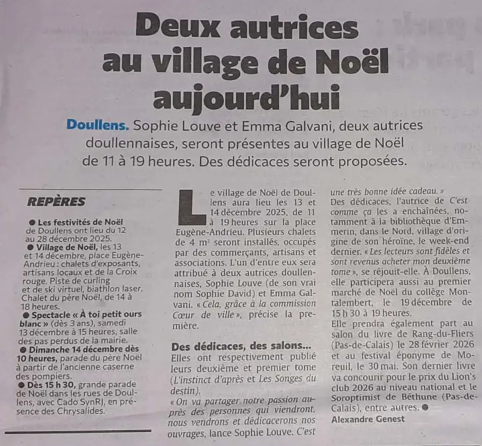- Samedi 19 décembre 2025 : vente et dédicace au Marché de Noël du collège Montalembert à Doullens (de 16h30 à 19 h)