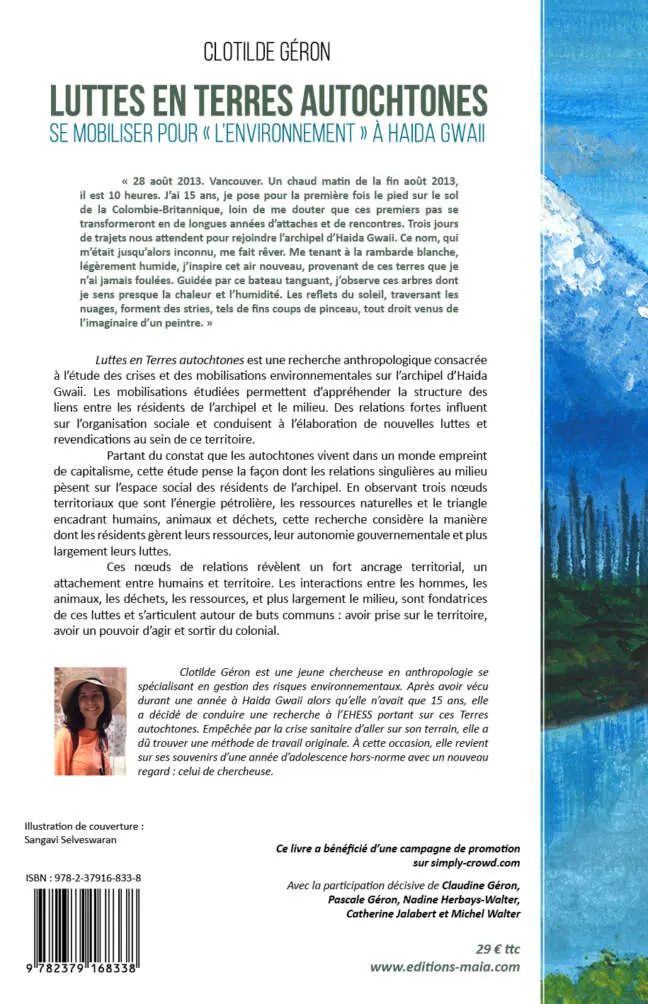 Luttes en Terres autochtones est une recherche anthropologique consacrée à l’étude des crises et des mobilisations environnementales sur l’archipel d’Haida Gwaii. Les mobilisations étudiées permettent d’appréhender la structure des liens entre les résidents de l’archipel et le milieu. Des relations fortes influent sur l’organisation sociale et conduisent à l’élaboration de nouvelles luttes et revendications au sein de ce territoire.