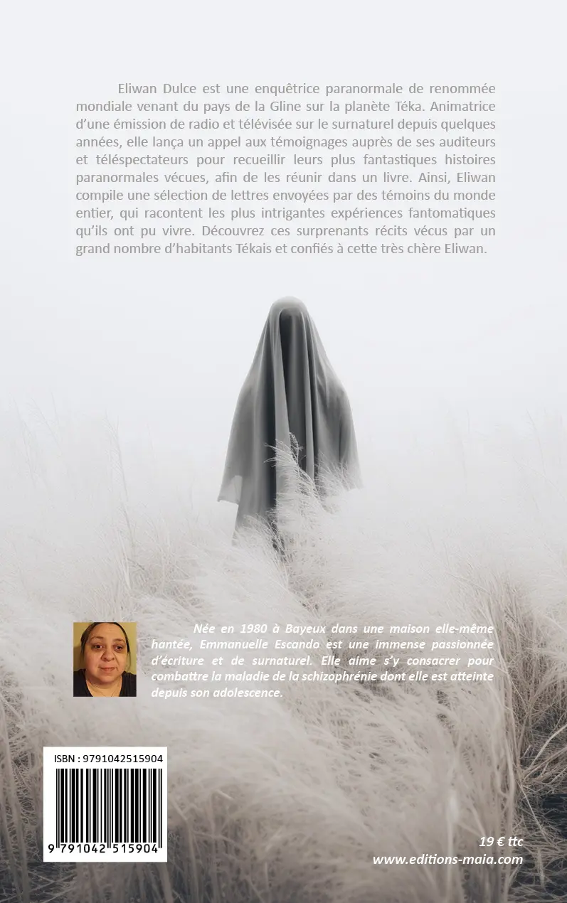 Eliwan Dulce est une enquêtrice paranormale de renommée mondiale venant du pays de la Gline sur la planète Téka. Animatrice d’une émission de radio et télévisée sur le surnaturel depuis quelques années, elle lança un appel aux témoignages auprès de ses auditeurs et téléspectateurs pour recueillir leurs plus fantastiques histoires paranormales vécues, afin de les réunir dans un livre. Ainsi, Eliwan compile une sélection de lettres envoyées par des témoins du monde entier, qui racontent les plus intrigantes expériences fantomatiques qu’ils ont pu vivre. Découvrez ces surprenants récits vécus par un grand nombre d’habitants Tékais et confiés à cette très chère Eliwan.