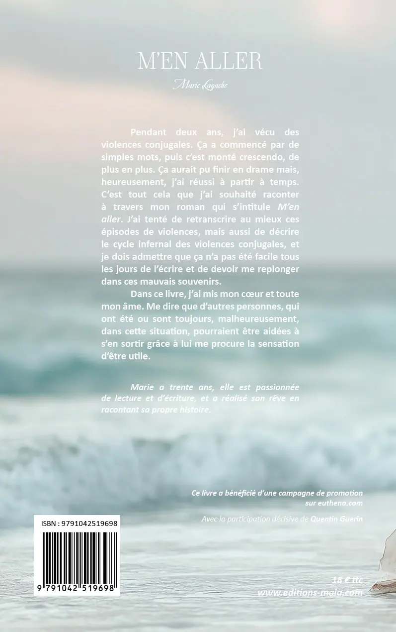 Pendant deux ans, j’ai vécu des violences conjugales. Ça a commencé par de simples mots, puis c’est monté crescendo, de plus en plus. Ça aurait pu finir en drame mais, heureusement, j’ai réussi à partir à temps. C’est tout cela que j’ai souhaité raconter à travers mon roman qui s’intitule M’en aller. J’ai tenté de retranscrire au mieux ces épisodes de violences, mais aussi de décrire le cycle infernal des violences conjugales, et je dois admettre que ça n’a pas été facile tous les jours de l’écrire et de devoir me replonger dans ces mauvais souvenirs.