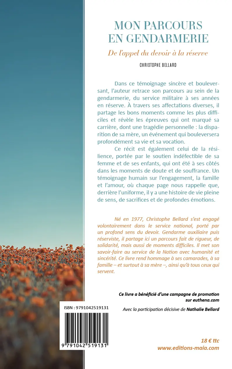 Né en 1977, Christophe Bellard s’est engagé volontairement dans le service national, porté par un profond sens du devoir. Gendarme auxiliaire puis réserviste, il partage ici un parcours fait de rigueur, de solidarité, mais aussi de moments difficiles. Il met son savoir-faire au service de la Nation avec humanité et sincérité. Ce livre rend hommage à ses camarades, à sa famille – et surtout à sa mère –, ainsi qu’à tous ceux qui servent.