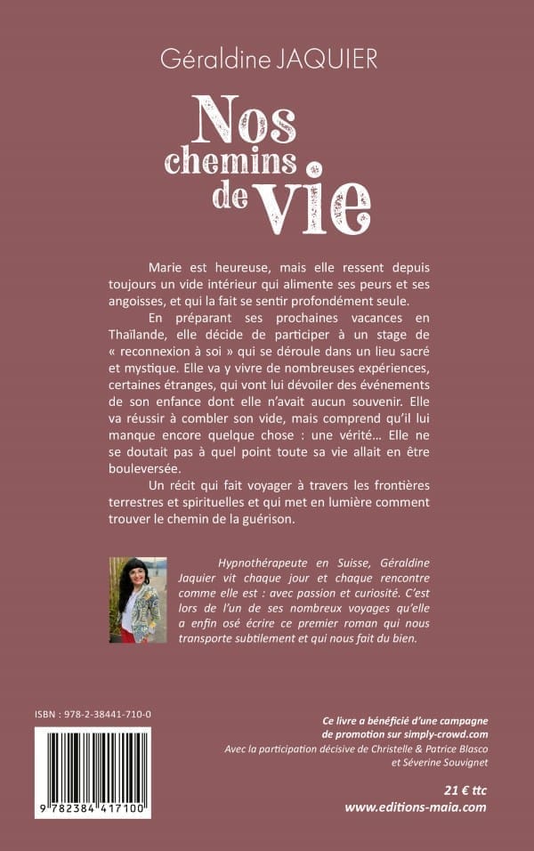 Hypnothérapeute en Suisse, Géraldine Jaquier vit chaque jour et chaque rencontre comme elle est : avec passion et curiosité. C’est lors de l’un de ses nombreux voyages qu’elle a enfin osé écrire ce premier roman qui nous transporte subtilement et qui nous fait du bien.