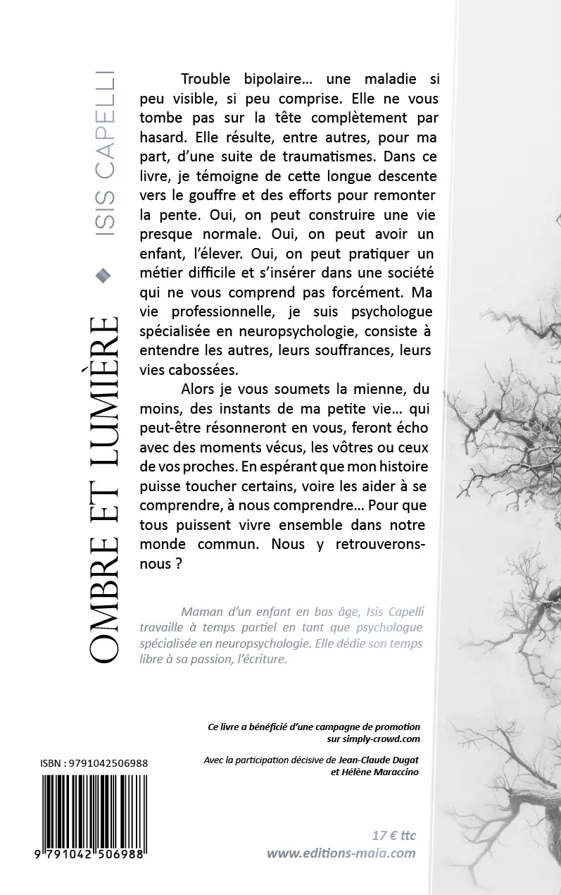 Trouble bipolaire… une maladie si peu visible, si peu comprise. Elle ne vous tombe pas sur la tête complètement par hasard. Elle résulte, entre autres, pour ma part, d’une suite de traumatismes. Dans ce livre, je témoigne de cette longue descente vers le gouffre et des efforts pour remonter la pente. Oui, on peut construire une vie presque normale. Oui, on peut avoir un enfant, l’élever. Oui, on peut pratiquer un métier difficile et s’insérer dans une société qui ne vous comprend pas forcément. Ma vie professionnelle, je suis psychologue spécialisée en neuropsychologie, consiste à entendre les autres, leurs souffrances, leurs vies cabossées.