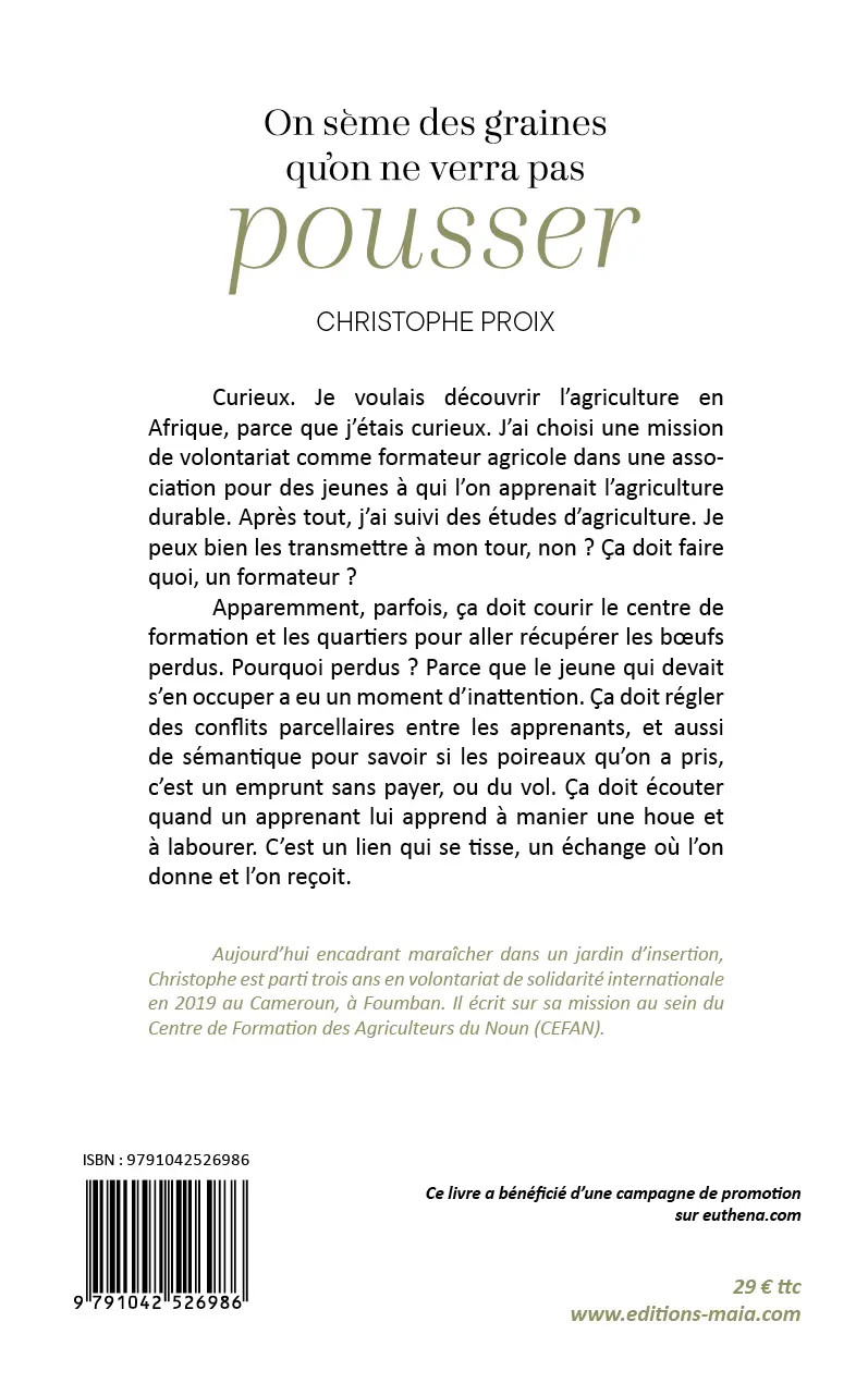 Aujourd’hui encadrant maraîcher dans un jardin d’insertion, Christophe est parti trois ans en volontariat de solidarité internationale en 2019 au Cameroun, à Foumban. Il écrit sur sa mission au sein du Centre de Formation des Agriculteurs du Noun (CEFAN).